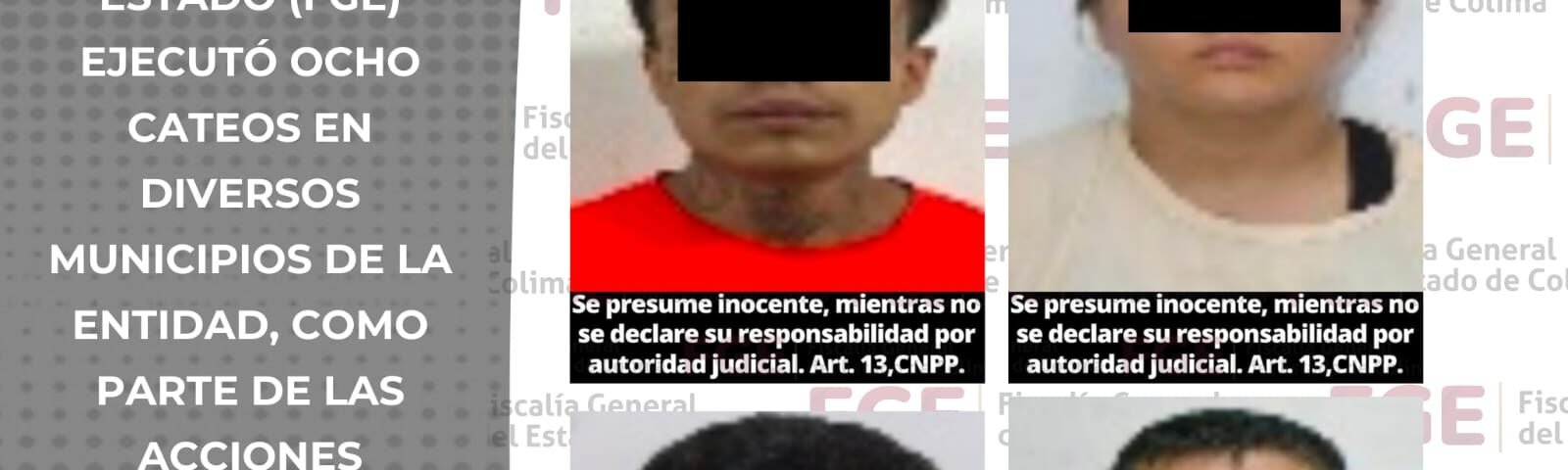 La Fiscalía General del Estado (FGE) ejecutó ocho cateos en diversos municipios de la entidad, como parte de las acciones permanentes para combatir la delincuencia y fortalecer la seguridad de la población colimense.