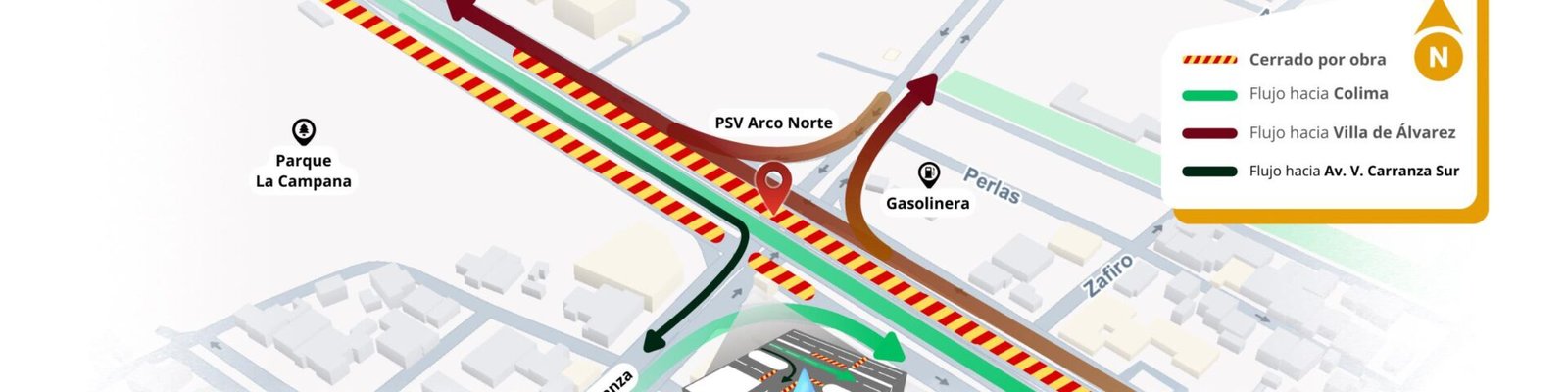 Como parte de los trabajos para la construcción del Paso Superior Vehicular Arco Norte, este jueves 28 de agosto fue habilitada la vuelta derecha por los carriles centrales del Tercer Anillo Periférico, en el sentido de Villa de Álvarez a Colima, hacia la avenida Venustiano Carranza, informa el Gobierno del Estado de Colima.