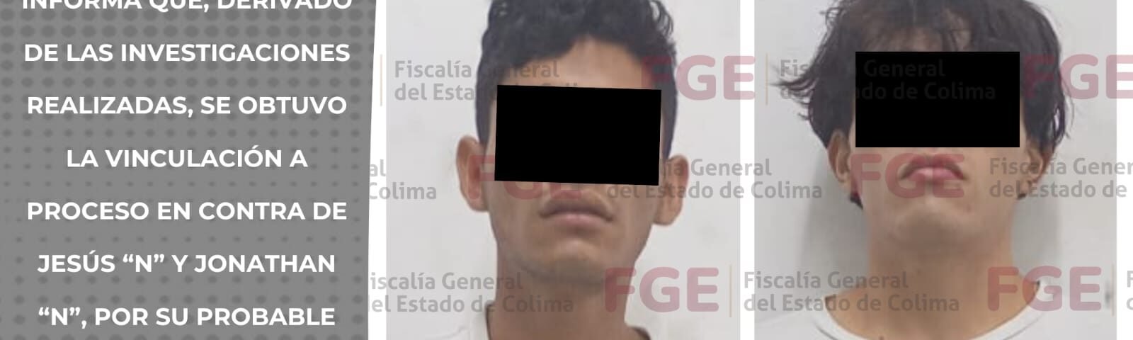 La Fiscalía General del Estado de Colima informa que, derivado de las investigaciones realizadas, se obtuvo la vinculación a proceso en contra de Jesús “N” y Jonathan “N”, por su probable responsabilidad en el hecho que la ley señala como delito de robo calificado con violencia y uso de arma.