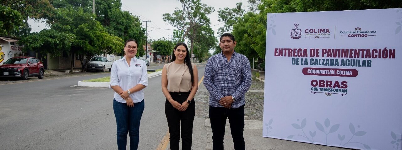 La gobernadora del estado de Colima, Indira Vizcaíno Silva, entrega la mañana de este miércoles una más de las #ObrasQueTransforman, correspondiente a la pavimentación de la Calzada Aguilar, en la cabecera municipal de Coquimatlán, con inversión cercana a 20 millones de pesos, a través del Fondo de Contraprestación de la Concesión de la autopista Colima-Armería, con lo que se beneficia a 20 mil 837 coquimatlenses.